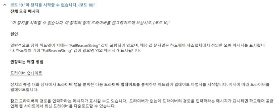 추가) 가끔 보이는 오류 코드 10에 대한 microsoft의 공식 답변입니다.