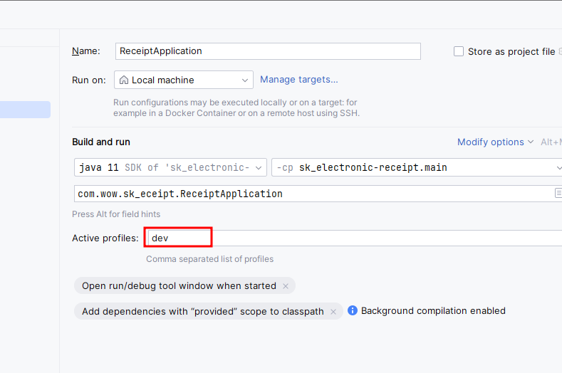 6. Active Profile을 환경에 맞게 두고 어플리케이션을 시작한다.