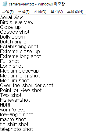 아래와 같이 카메라 시점을 많이 모아둔 텍스트 파일이 있다고 친다.