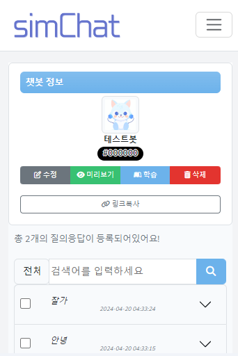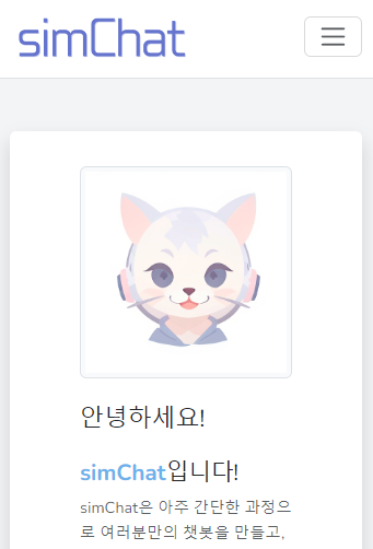 안녕하세요! simChat입니다! simChat은 아주 간단한 과정으로 여러분만의 챗봇을 만들고, 질문과 답변을 등록하여 여러분의 챗봇에 방문하는 사람들에게 준비된 상담을 진행할 수 있어요!