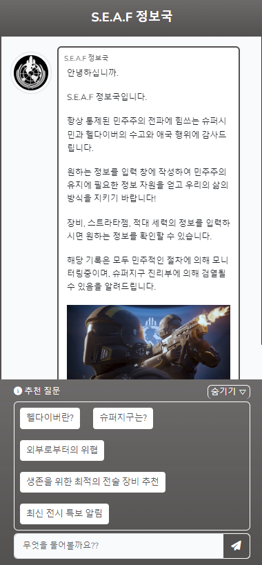 헬다이버즈 정보를 줄 수 있는 챗봇이 있다면 어떨까 생각하고