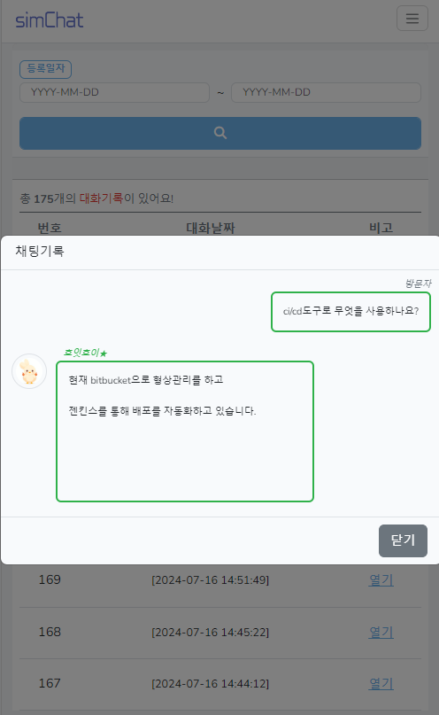 | [개인프로젝트] 개인용 챗봇 심챗(simChat) (2) | 2024.04.20 |