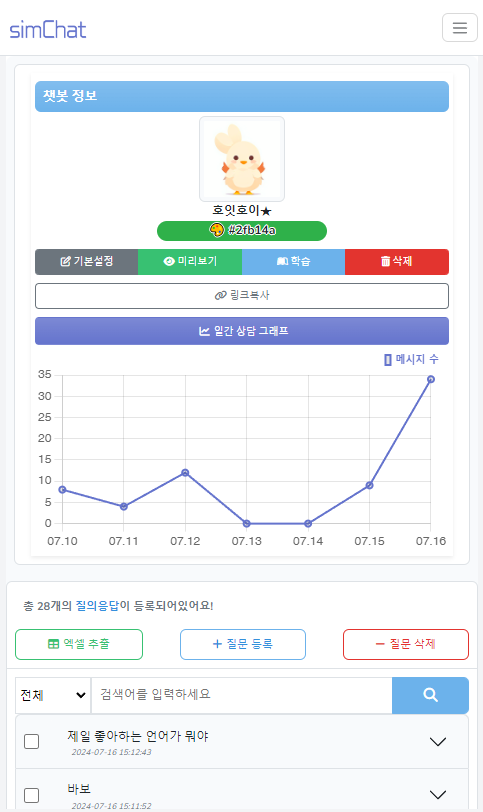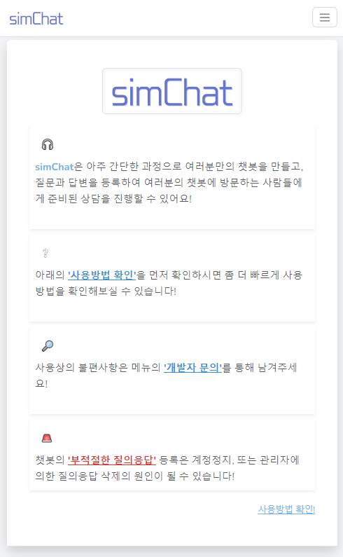 안녕하세요! simChat입니다! simChat은 아주 간단한 과정으로 여러분만의 챗봇을 만들고, 질문과 답변을 등록하여 여러분의 챗봇에 방문하는 사람들에게 준비된 상담을 진행할 수 있어요!