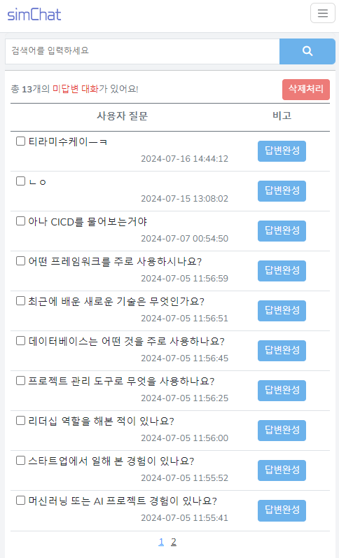 ※ 만약 유사도(similarity)가 너무 낮거나 아예 찾을 수 없는 질문을 물어볼 경우 '미답변'으로 분류하여 따로 DB에 저장하고 이전에 등록한 비슷한 질의응답 항목을 연결하거나 아예 새로운 질의응답을 작성한 후 다시 학습시켜 다음에는 대답할 수 있도록 한다.