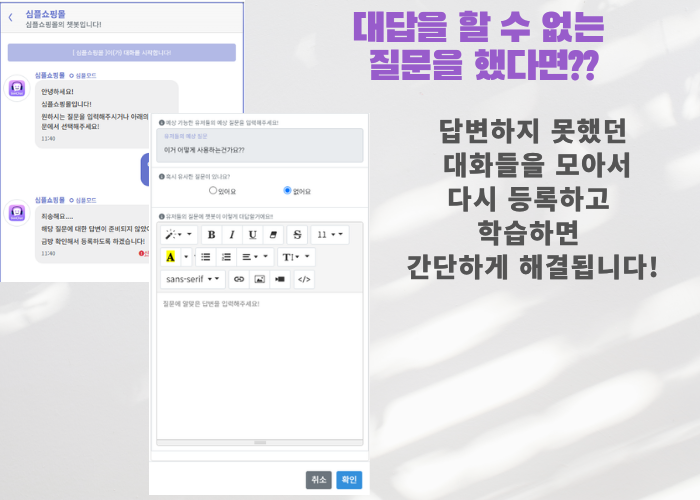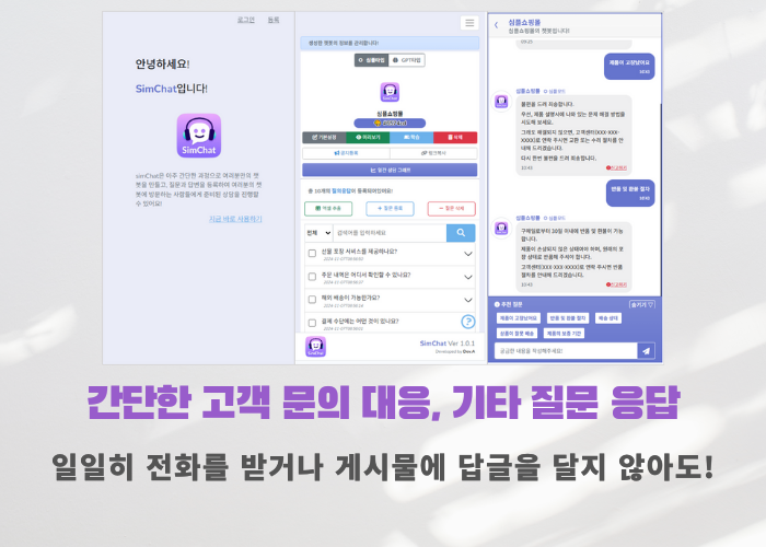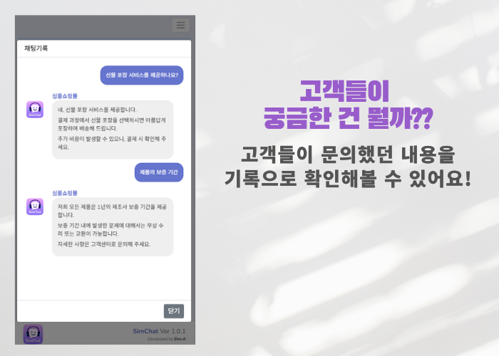 ** 쇼핑몰 챗봇 예시 : https://simchat.aimor.site/msg?c_key=5370d1e4-5e5a-42c0-9ef0-16c53cd0c064