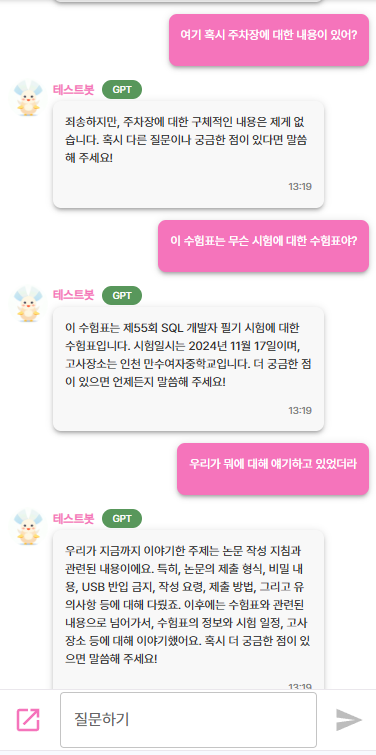 아래는 테스트 챗봇을 제작하여,